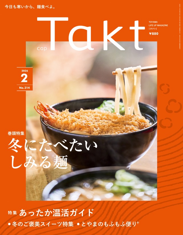 新しい年の空気が澄みわたり、心も身体もリセットしたくなる今日このごろ。寒さが深まるこの季節、ほっとひと息つけるあたたかな時間を楽しみませんか? 今月号の巻頭特集は「冬にたべたい しみる麺」。 だしの旨みが体の芯まで染みわたる一杯や、思わず笑みがこぼれる名店をめぐりながら、富山ならではの麺文化をご紹介します。 そして後半では、サウナや岩盤浴などの「温活」をピックアップ! じんわり汗を流して心身をととのえる、冬にうれしい癒やしスポットをお届けします。 この一冊とともに、新年のスタートにぴったりな、あたたかな冬時間をお楽しみください。